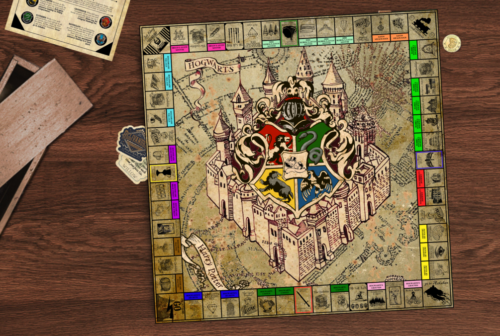A board game centered around the Harry Potter Universe, designed around the classic Monopoly game with a few extra surprises to immerse yourself and fellow players as citizens of the Wizarding World: from getting your own wand and being sorted into a Hogwarts house, to dueling over properties and taking lucky strolls after winning some Felix Felicis.